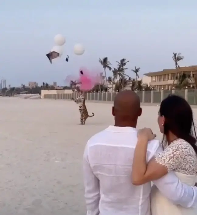 Como se muestra en las imágenes, el tigre parece estar en una playa junto al hotel Burj Al Arab, donde se enfrenta a unos globos llenos de polvo que revelarán el sexo del bebé.