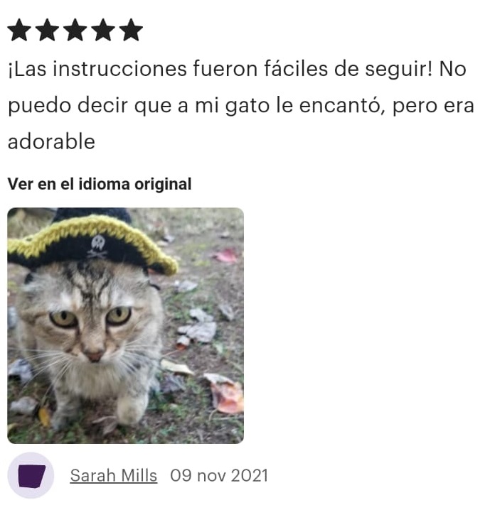 Se trata de reseñas de sombreros tejidos para gatos, cada reseña tiene bien merecido "5 estrellas, sombrero increíble" y luego una foto del gato luciendo absolutamente fabuloso.